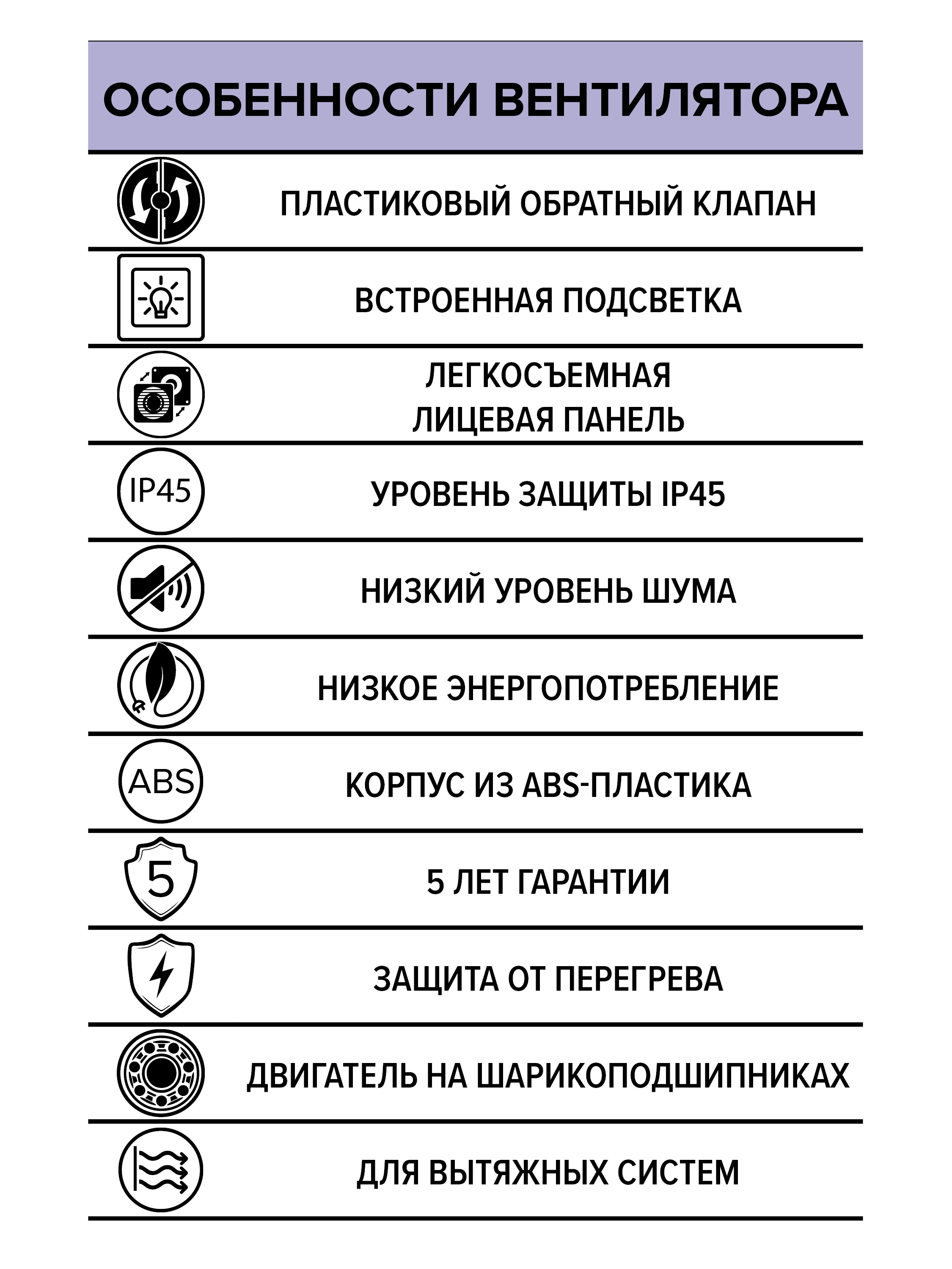 Легкосъемная лицевая панель обеспечивает быстрый доступ к внутренним элементам вентилятора для очистки и обслуживания. Также вентилятор оснащен бесшумным обратным клапаном, который предотвращает проникновение неприятных запахов из шахты.