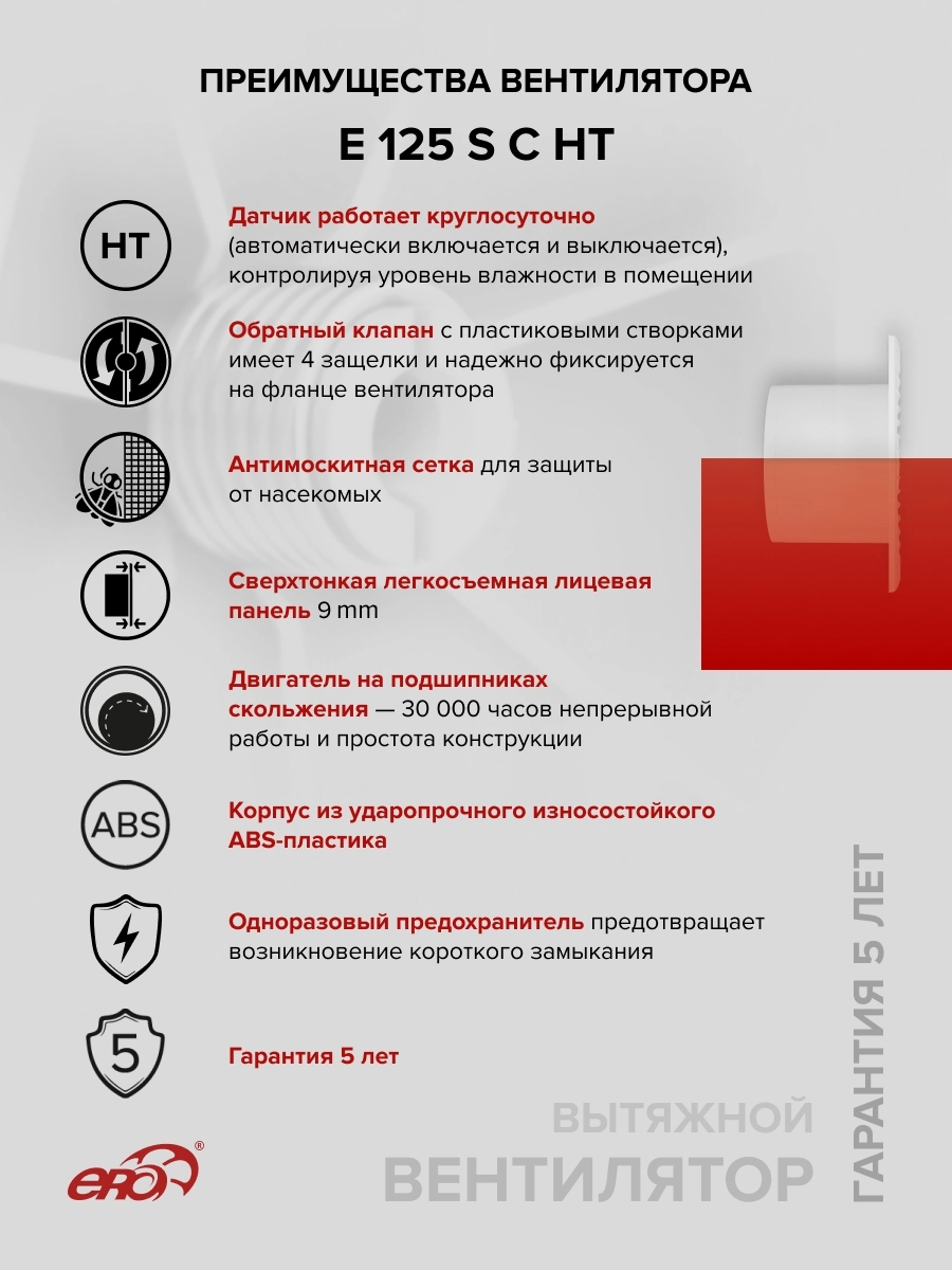 Вентилятор оснащен одноразовым предохранителем для предотвращения возникновения короткого замыкания, обратным клапаном для предотвращения попадания пыли и запахов из вентиляционного канала, антимоскитной сеткой, которая защищает помещение от проникновения насекомых и грязи из шахты.