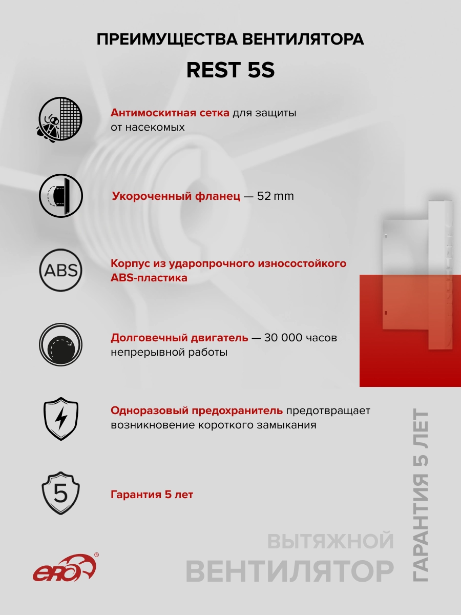 Высокое качество сборки обеспечивает надежное крепление крыльчатки. Короткий фланец (52 мм) существенно упрощает установку вентилятора в ограниченном пространстве.Лаконичный дизайн вентилятора с горизонтальными жалюзи идеально дополнит любой интерьер.