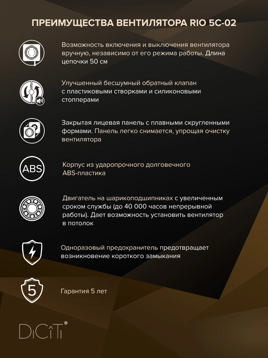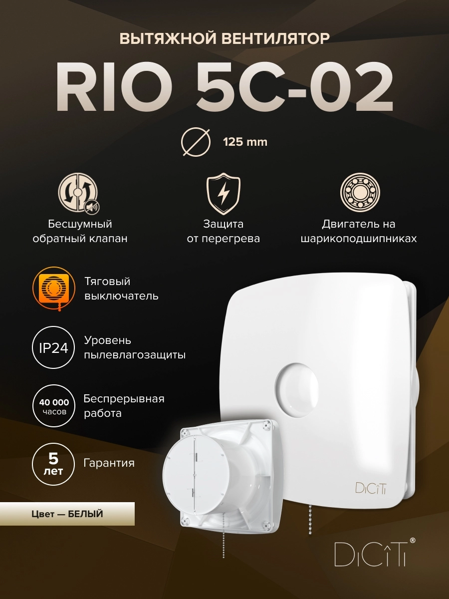 Долговечный двигатель на шарикоподшипниках гарантирует до 40 000 часов непрерывной работы, предохранитель Termo fuse отключит вентилятор при нагреве обмотки свыше +130 °C. RIO можно установить как в стену, так и в потолок (при снятии обратного клапана), двигатель не требует дополнительного обслуживания.