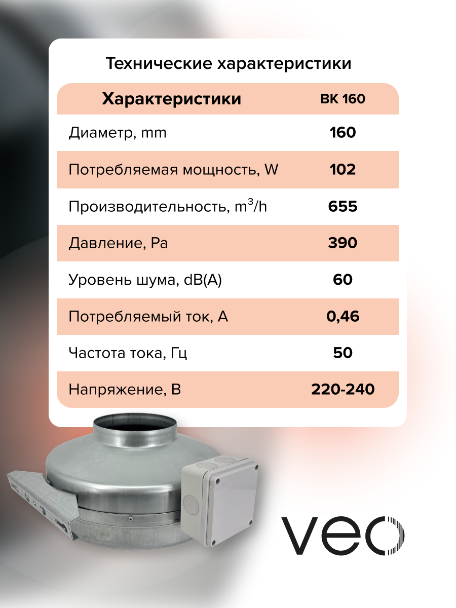 Коммерческий канальный центробежный вентилятор, выполненный в корпусе из оцинкованной стали. Предназначен для установки в любой точке приточно-вытяжной вентиляционной системы и под любым углом. В вентилятор устанавливается однофазный двигатель на шарикоподшипниках с внешним ротором, который оснащен рабочим колесом с загнутыми назад пластиковыми лопатками. Мотор имеет тепловую защиту с автоматическим перезапуском. Подключение осуществляется в герметичной клеммной коробке с откидной крышкой. В коробку с вентилятором вкладывается кронштейн для монтажа к поверхности и два винта для крепления кронштейна к корпусу.