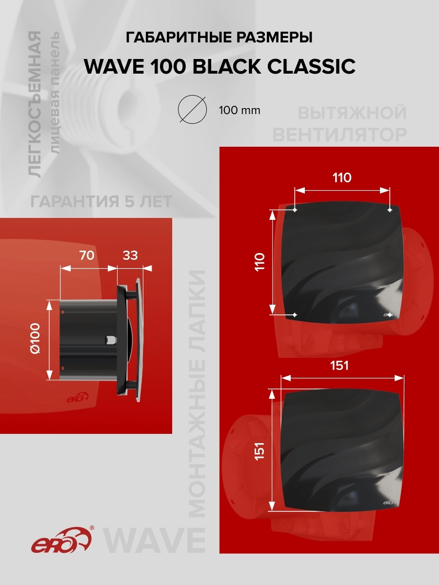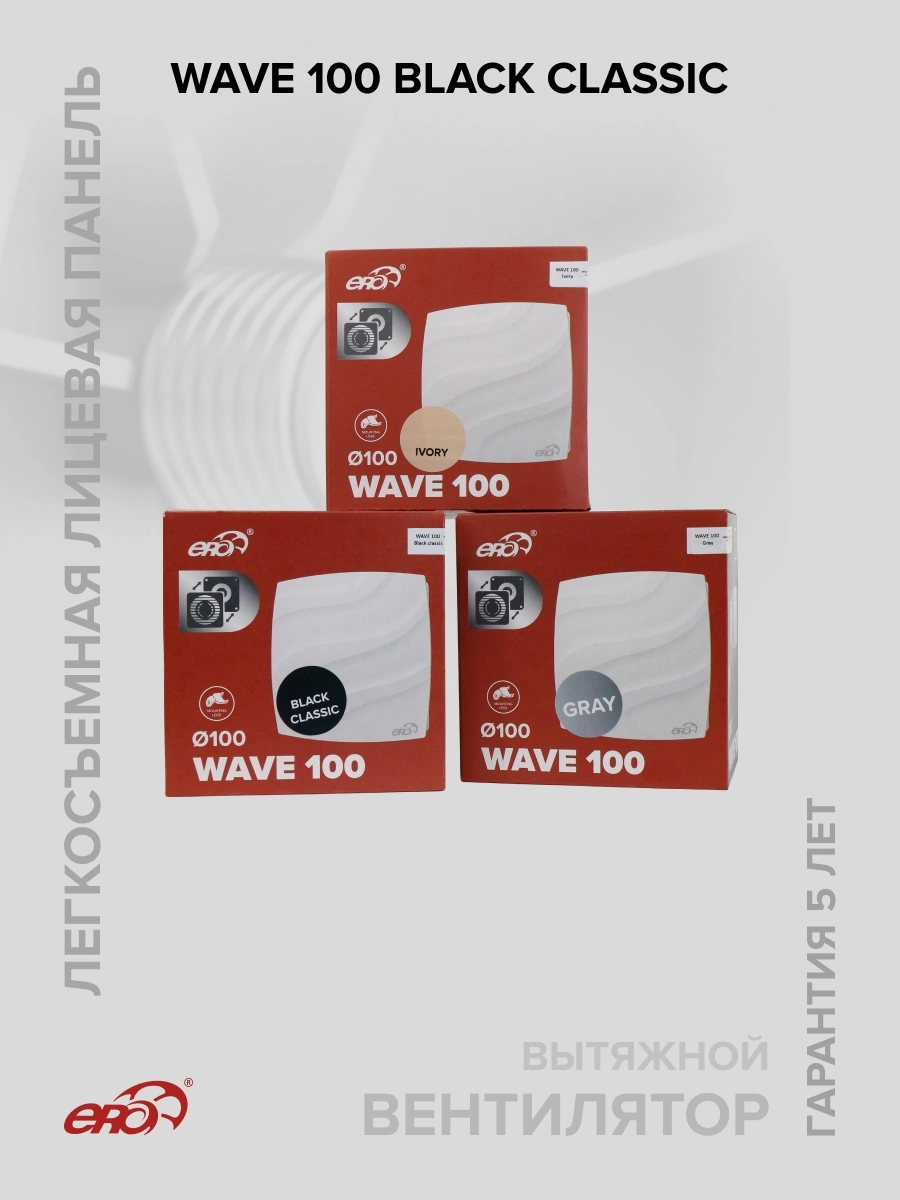 Также впервые в торговой марке ERA представлены вентиляторы в различных цветовых решениях. WAVE 100 Black classic имеет глубокий черный глянцевый оттенок. Также в серии представлены в сером цвете (WAVE 100 Gray) и в оттенке слоновой кости (WAVE 100 Ivory).
