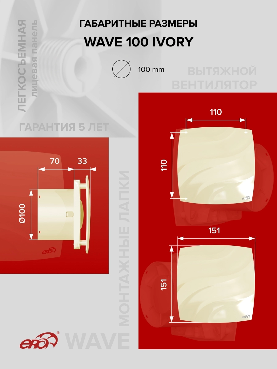 Также впервые в торговой марке ERA представлены вентиляторы в различных цветовых решениях. WAVE 100 Ivory имеет глянцевый оттенок слоновой кости. Также в серии представлены модели в черном (WAVE 100 Black classic) и сером (WAVE 100 Gray) цветах.