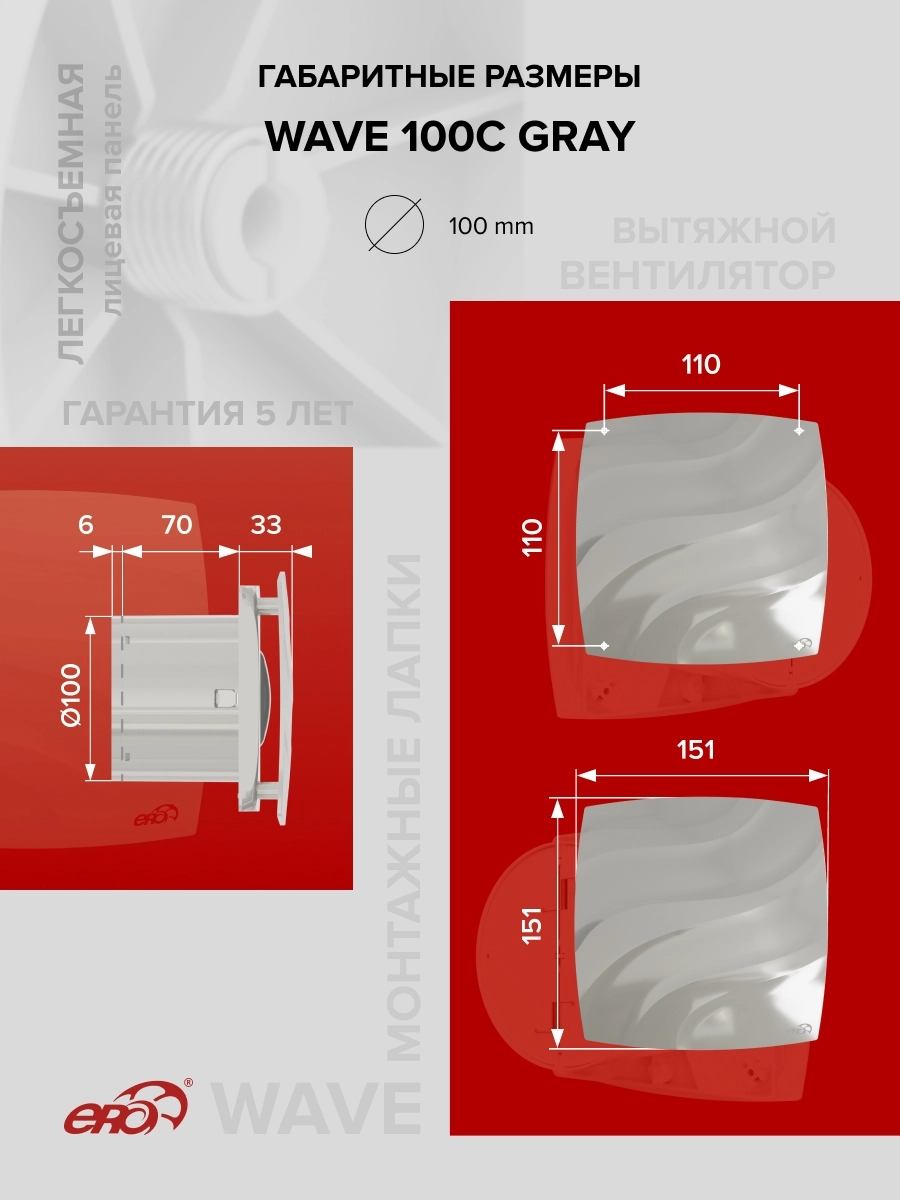 Также впервые в торговой марке ERA представлены вентиляторы в различных цветовых решениях. WAVE 100C Gray имеет серый глянцевый оттенок. Также в серии представлены модели в черном цвете (WAVE 100C Black classic) и в оттенке слоновой кости (WAVE 100C Ivory).