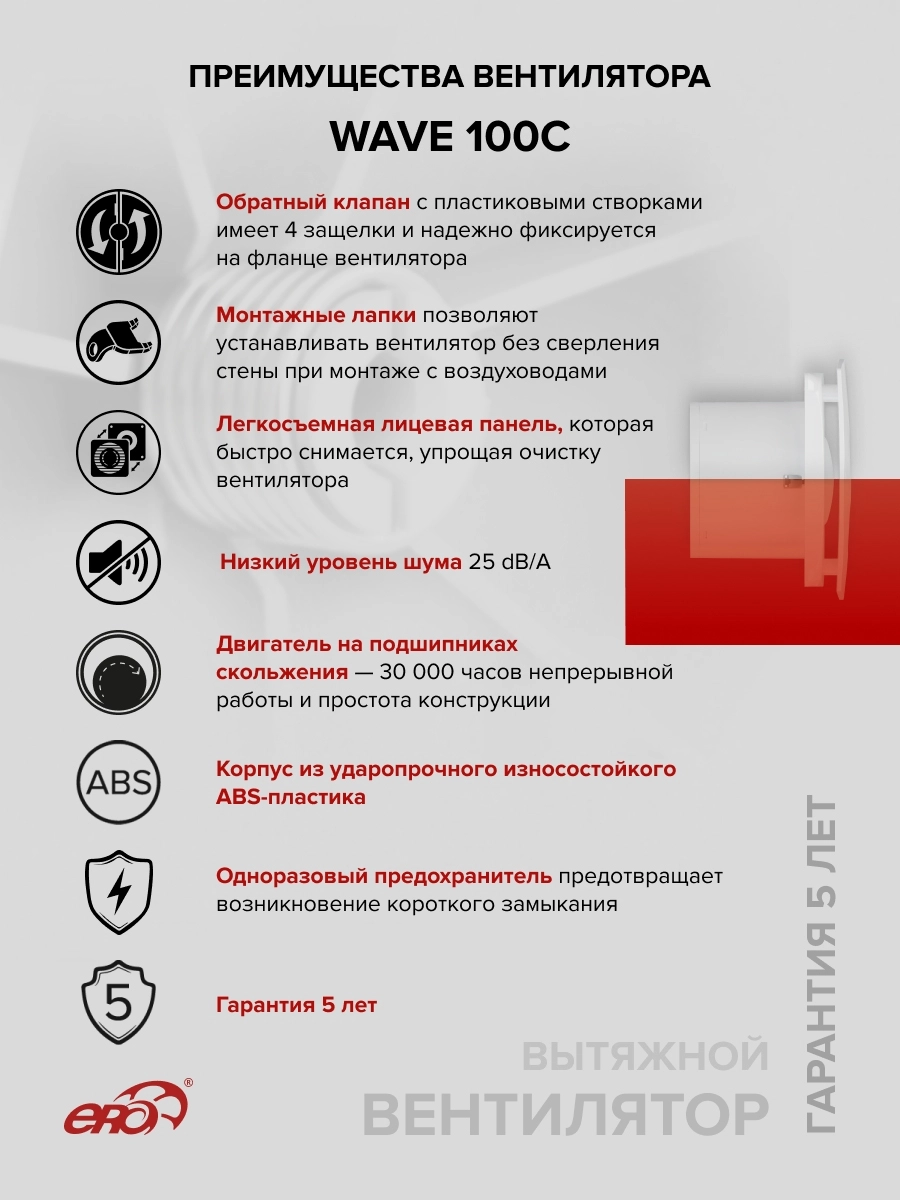Вытяжной бытовой вентилятор WAVE применяется для постоянной и периодической вентиляции санузлов, ванных комнат, кухонь и других помещений для удаления влаги, и поддержания оптимального микроклимата. Подходит для монтажа в вентиляционные шахты и соединения с воздуховодами.
