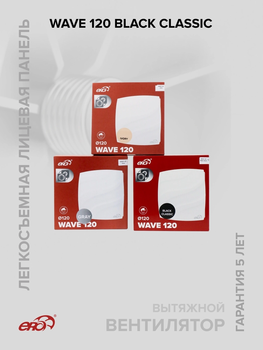 Также впервые в торговой марке ERA представлены вентиляторы в различных цветовых решениях. WAVE 120 Black classic имеет глубокий черный глянцевый оттенок. Также в серии представлены модели в сером цвете (WAVE 120 Gray) и в оттенке слоновой кости (WAVE 120 Ivory).