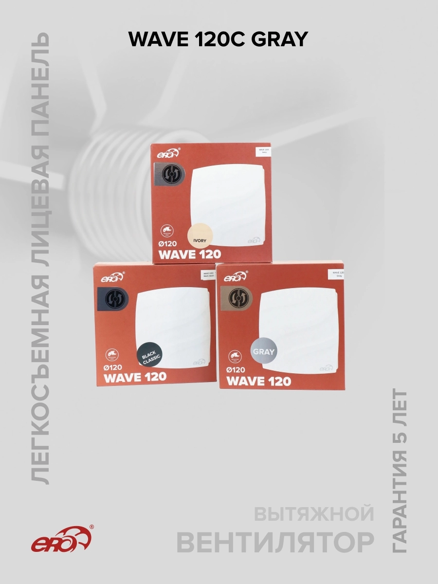 Также впервые в торговой марке ERA представлены вентиляторы в различных цветовых решениях. WAVE 120C Gray имеет серый глянцевый оттенок. Также в серии представлены модели в черном цвете (WAVE 100C Black classic) и в оттенке слоновой кости (WAVE 100C Ivory).